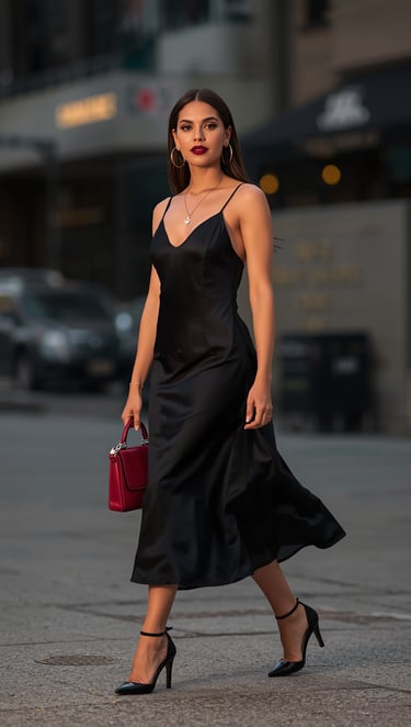 When styling this look, keep your shoes neutral if your dress has patterns or strong colors. Let the bag act as the intentional pop that ties everything together. This outfit is perfect for dinner dates, events, or any moment where you want to feel powerful and polished 🌙💋