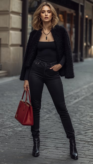 The key here is texture. If everything is matte black, add dimension with leather boots 👢, denim, or a structured bag finish. Mixing materials keeps the outfit from looking flat. Also, keep the silhouette clean , fitted top with straight-leg pants or oversized blazer with slim bottoms so your shape stays defined.
