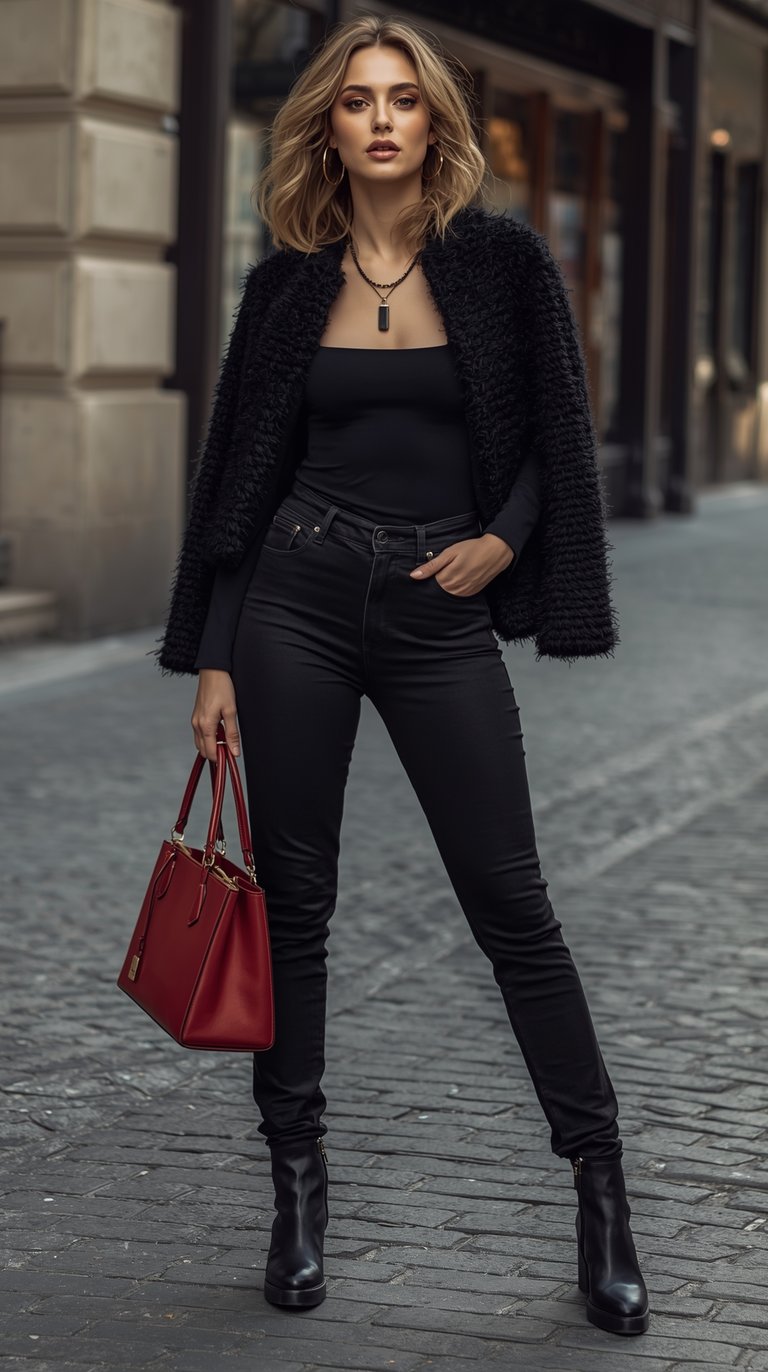 Black and red together always feel confident and bold. A black bodysuit, black denim, or a black midi dress creates the perfect dramatic base for your cherry red bag to shine. The contrast is strong but elegant , and it works for day or night 🌙