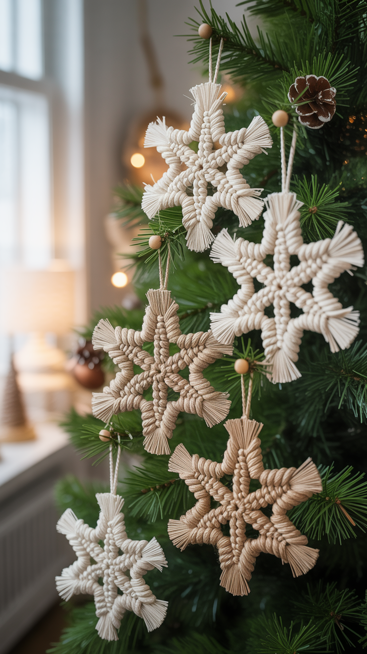 Macramé isn’t just for wall hangings — tiny knotted ornaments can bring a cozy, handmade touch to your tree. They look intricate and expensive, yet they’re surprisingly easy to make with just some cord and basic knots. These are perfect if you love a modern boho or neutral holiday aesthetic.