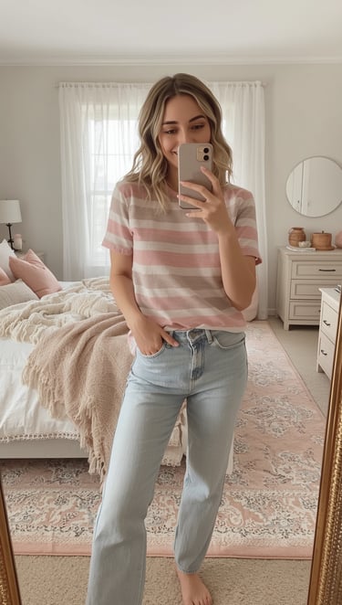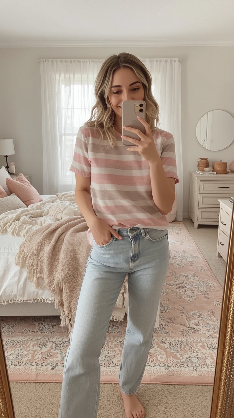 A lightweight slub knit with small-scale stripes in dusty lavender, pale blue, or faded blush on a cream base feels softly polished. Tuck or knot it into high-rise straight jeans to keep lines clean.