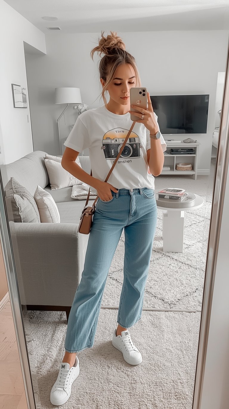 Tips: Shorter tee lengths tuck cleanly into high-rise jeans; if long, a front tuck keeps things tidy.