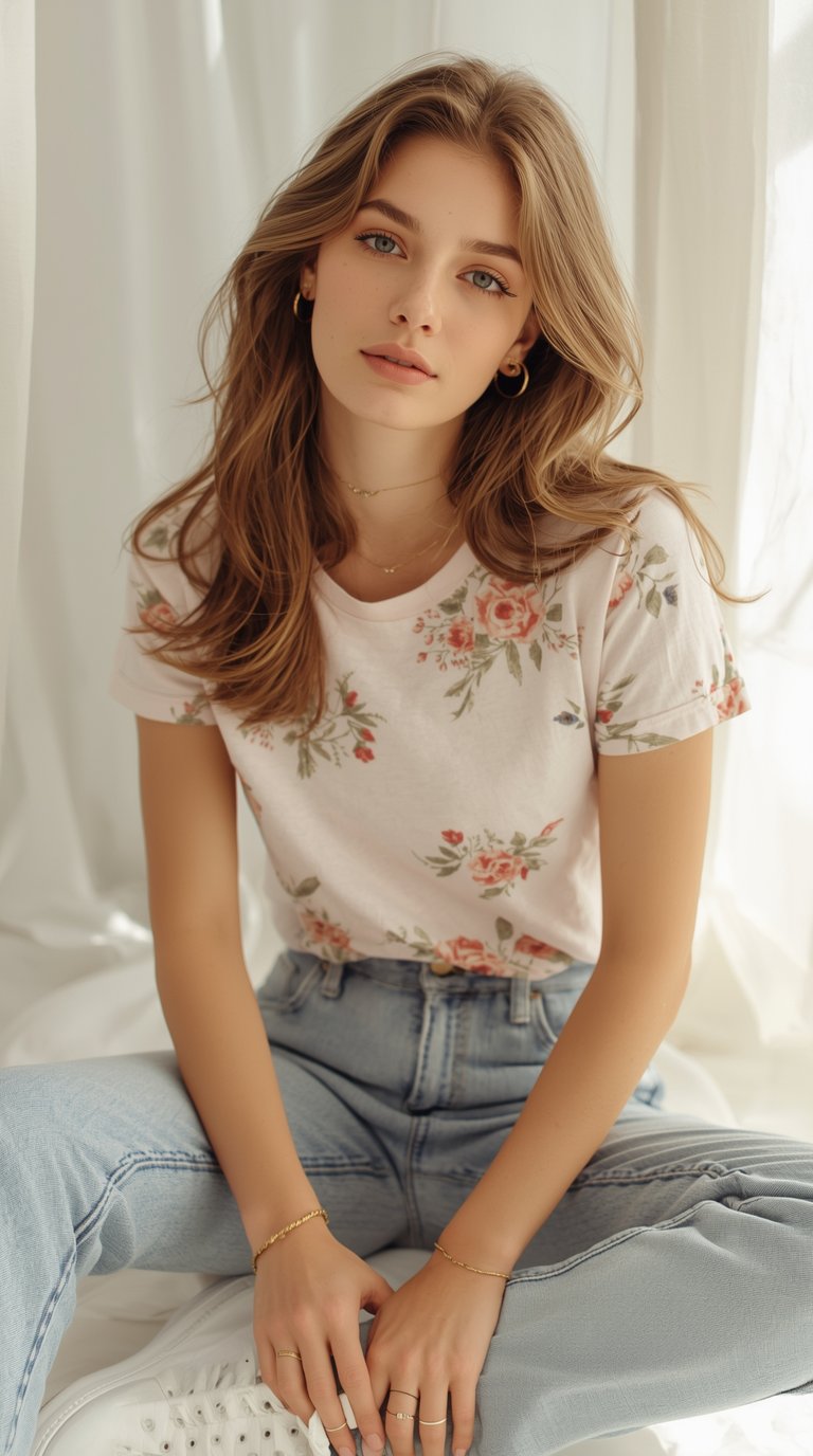 Lightweight jersey or cotton blends with hand-drawn botanical sketches in cream, oat, or soft sage feel airy and romantic. Tuck into relaxed faded jeans and add woven accessories for cozy countryside charm.