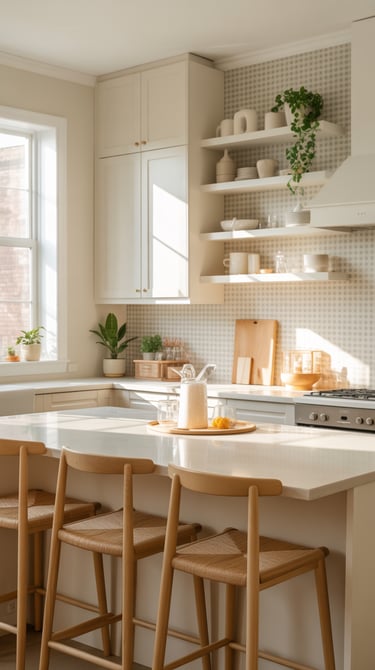 ✨ Picture This: A sun-filled kitchen with blush-pink gingham behind the stove, open wood shelves displaying white ceramic dishes, tiny potted herbs on the counter, and a matching pastel kettle on the stove. The overall feel is cozy, stylish, and just a little dreamy—the kind of kitchen that makes you want to linger over breakfast.