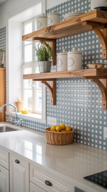✨ Picture This: A farmhouse-inspired kitchen with alternating gingham and white subway tiles behind the stove, a natural wood floating shelf above, and sunlight highlighting the crisp lines. Small ceramic jars with herbs and utensils sit on the countertop, perfectly tying the design together.