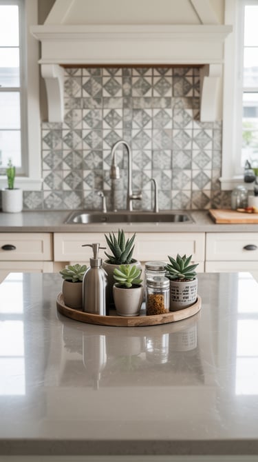 Add warmth and greenery: Wooden cutting boards, ceramic vases, or small potted plants balance the crispness of textured tiles.