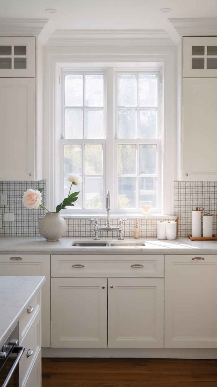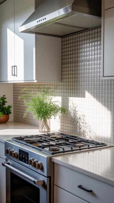 ✨ Picture This: A light-filled kitchen with a mini gingham mosaic backsplash behind the sink. White cabinets, light quartz countertops, and small decorative jars create a soft, elegant space. The tiny tile pattern adds texture and interest without taking over the room—subtle, charming, and oh-so-stylish.