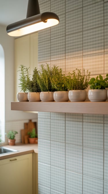 Style your layered backsplash: Add small potted herbs, spice jars, or a few decorative items on the shelf to enhance depth.