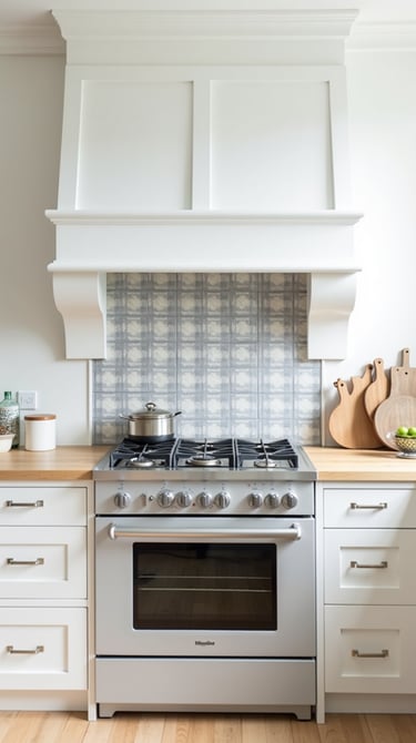 ✨ Picture This: A cozy kitchen with a blue-and-white gingham backsplash just behind the stove, white cabinetry, a light wood countertop, and a tiny pot of fresh basil. The rest of the wall stays crisp and simple, letting the gingham section shine as the perfect focal point.