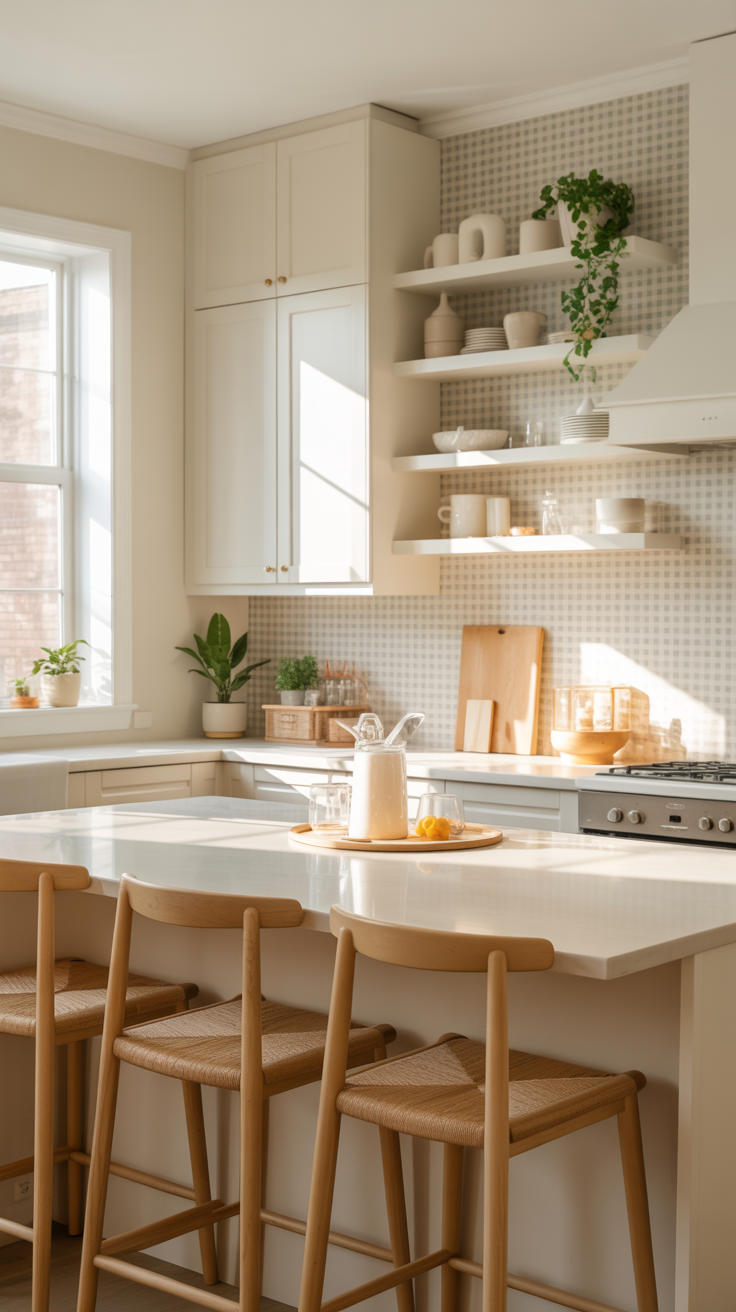 ✨ Picture This: A bright kitchen with floating wood shelves against a gray-and-white gingham backsplash. White dishes, small plants, and a few ceramic jars sit neatly on the shelves. Sunlight reflects off the countertop, making the space feel cozy, curated, and totally Instagram-ready.