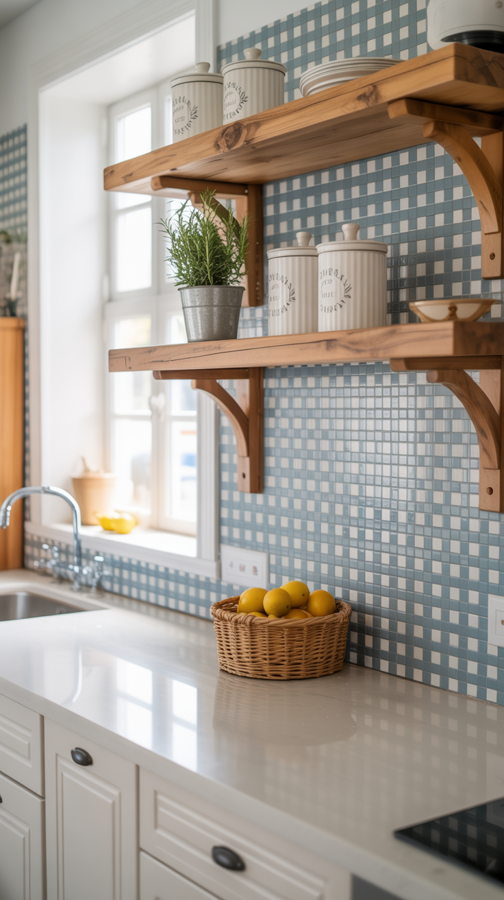 Install floating shelves: Choose light or medium wood tones to contrast gently with your gingham.