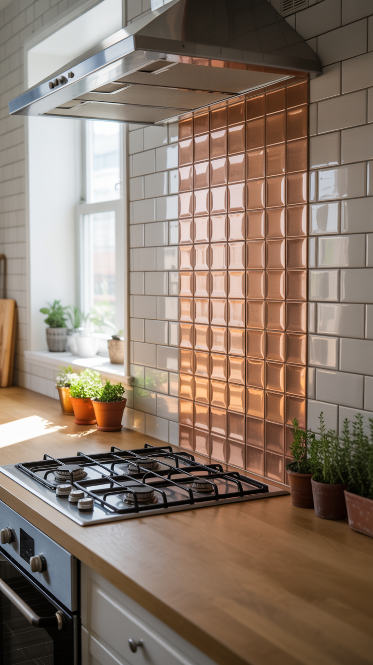 ✨ Picture This: A modern kitchen with white subway tiles and a single row of copper gingham tiles behind the stove. Matte black hardware, light wood countertops, and tiny potted herbs make the space feel chic, cozy, and effortlessly elevated.