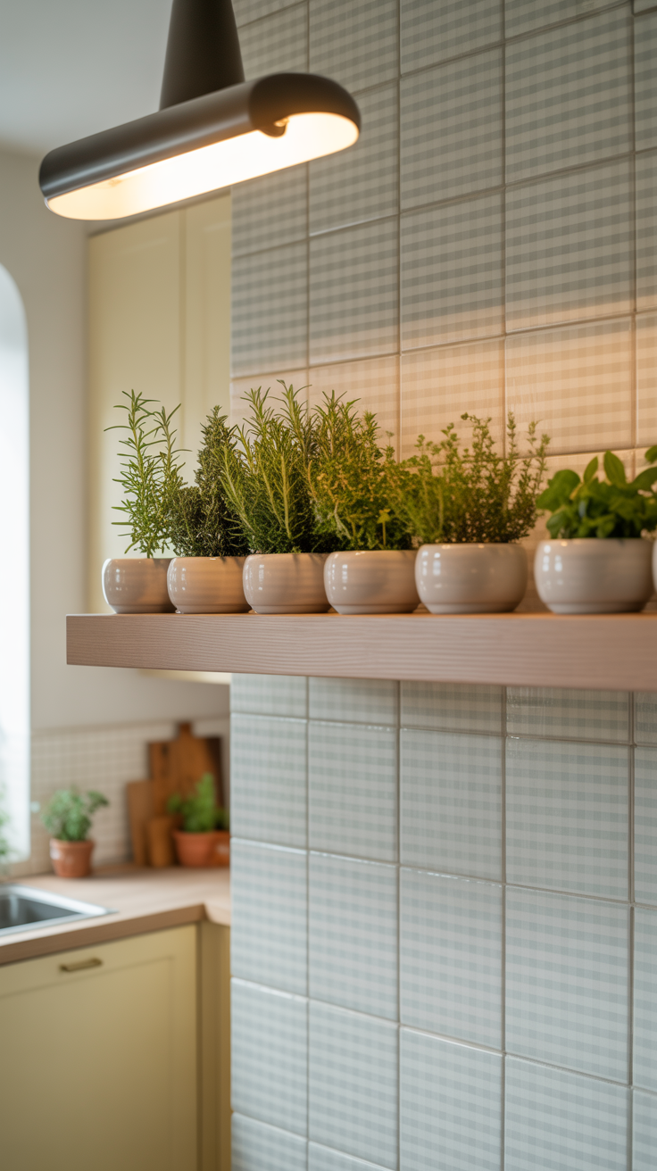 ✨ Picture This: A kitchen with a soft gray gingham backsplash, a medium wood floating shelf above it, and a few ceramic pots with herbs and spices. Warm light from a pendant fixture highlights the layered texture, making the space feel both cozy and stylish.