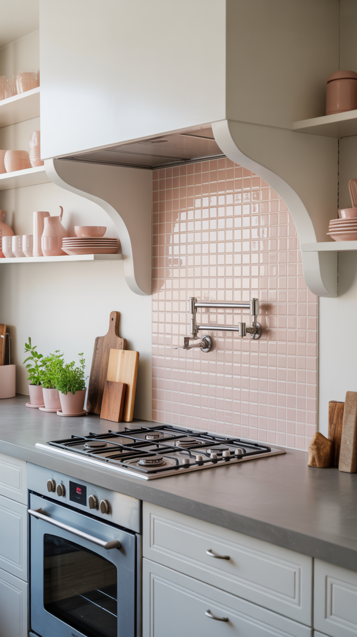 ✨ Picture This: A crisp white kitchen with a single blush-pink gingham stripe behind the stove, soft gray countertops, and matching pastel dishware. Small potted herbs and a wooden cutting board complete the cozy yet lively look, making the backsplash a cheerful focal point.