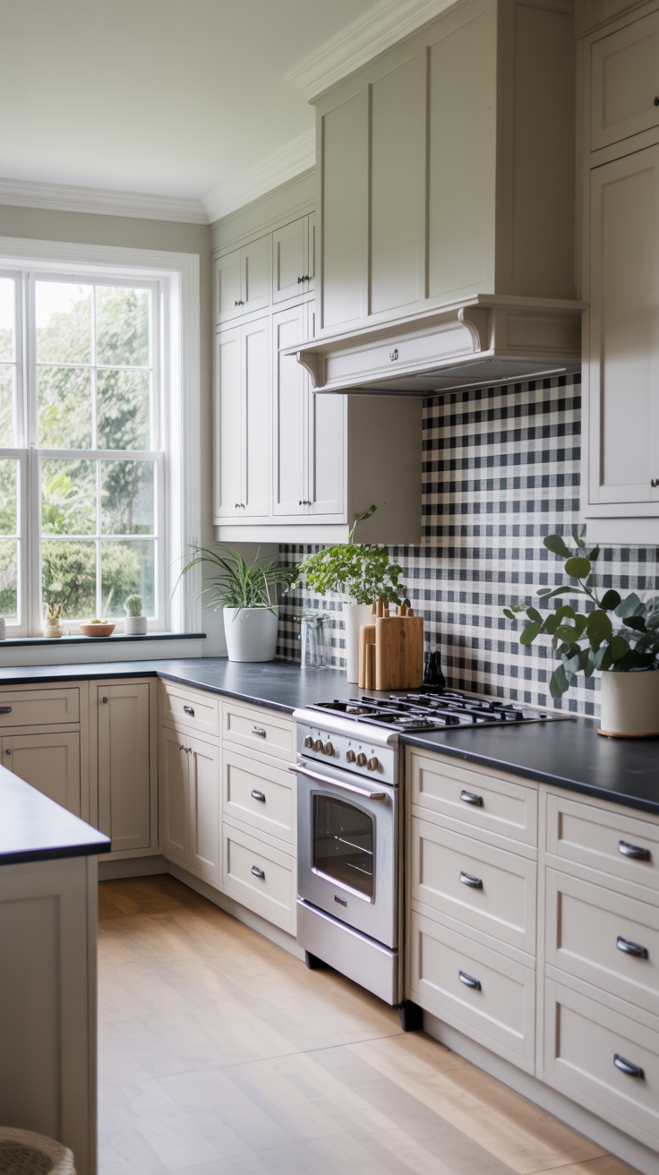✨ Picture This: A crisp kitchen with a bold black-and-white gingham backsplash behind the stove. White shaker cabinets, a light wood countertop, matte black hardware, and a couple of tiny potted herbs on the counter. The black-and-white pattern gives you drama, but the accessories make it approachable and lived-in.