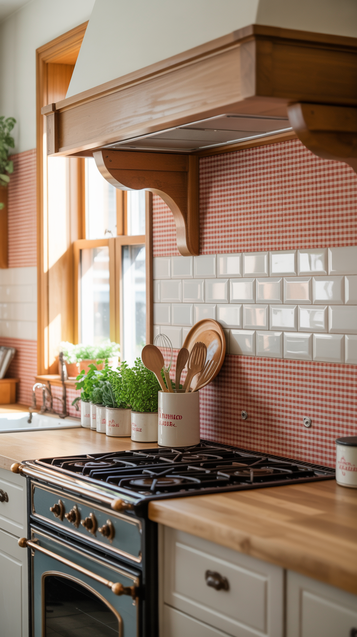 Adding wood accents to a gingham backsplash is a game-changer for warmth, texture, and personality. A small wood shelf, trim, or even a countertop edge layered with gingham creates depth and makes the space feel curated and intentional.