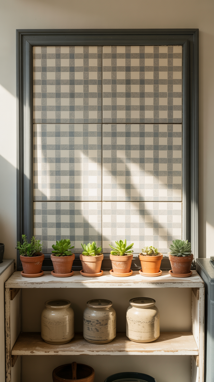 ✨ Picture This: A small square of gray-and-white gingham tiles framed like wall art above the kitchen counter. Wooden shelves nearby hold tiny potted plants and ceramic jars. The framed gingham acts as a statement piece, giving the kitchen personality without overwhelming the space.