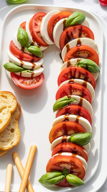 Alternate tomato and mozzarella slices in a curved striped line. Add basil leaves for contrast and drizzle balsamic glaze just before serving. You can place crostini or breadsticks on the side for dipping.