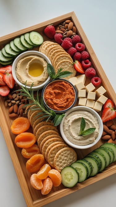 Start with bowls of hummus or dip, then surround them with rows of sliced cucumbers, crackers, fruit, and nuts. Add rainbow color by grouping ingredients with similar tones together oranges with apricots, reds with berries, greens with cucumbers. Add mint or rosemary for a festive finish.