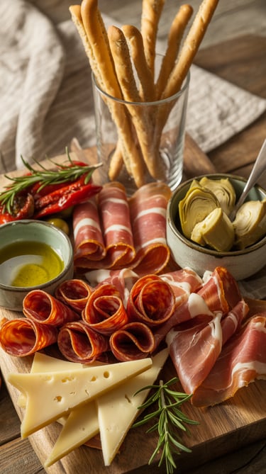 Lay prosciutto in loose ribbon-style folds this makes it look full and luxurious. Roll or fold soppressata slices and place them in clusters. Cut asiago into triangles and stack them like little mountains. Add olives and artichokes in tiny bowls and drizzle olive oil for dipping. Breadsticks look beautiful standing upright in a glass very Italian, very dramatic.