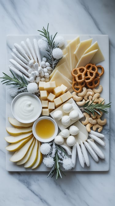 If your décor is white, silver, or “winter wonderland,” this board feels like freshly fallen snow. Think white cheddar, mozzarella pearls, pears, white pretzels, cashews, almonds, and sugared rosemary.