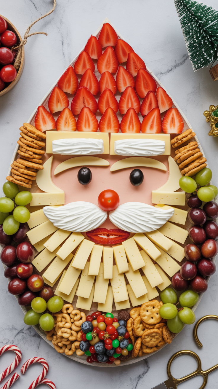 Place mozzarella slices into a beard shape (stack them slightly overlapping so it looks fluffy). Add strawberry halves upward to create Santa’s hat, then olives or blueberries for eyes. A cherry tomato becomes his nose. Add grapes, crackers, nuts, and holiday candies along the sides so it looks full and colorful. Kids will gasp, adults will take photos, and suddenly your board becomes entertainment.