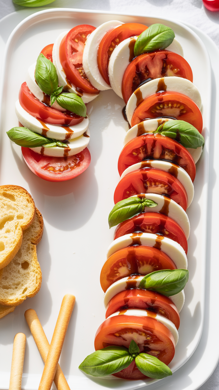 This one goes viral on Pinterest every year. Tomatoes and mozzarella slices in a candy cane shape, topped with basil and balsamic glaze… simple, elegant, and done in minutes.
