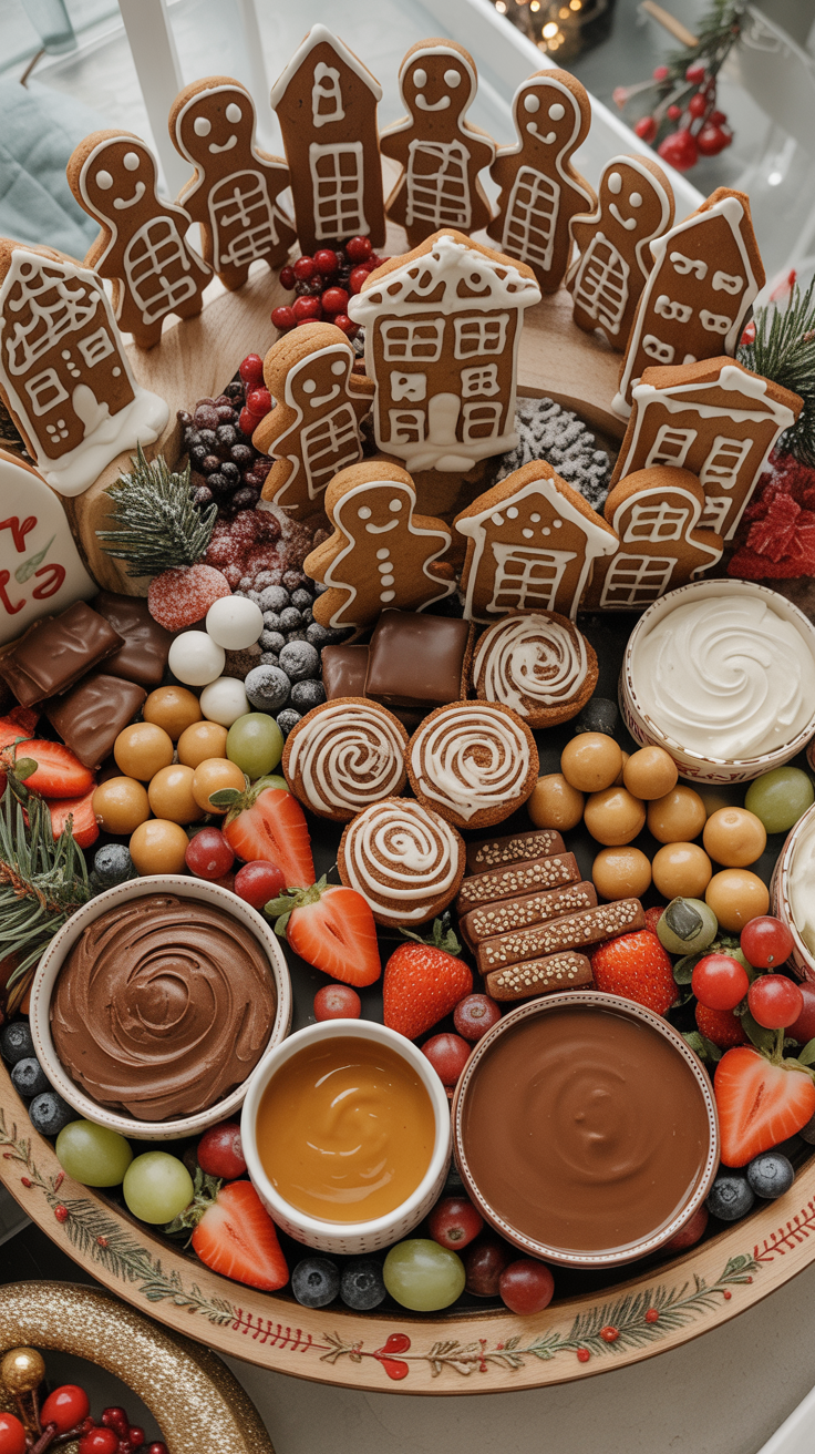 Stand gingerbread cookies upright so they form a mini cookie village it’s adorable. Add chocolates and truffles around the sides like ornaments. Place fruit for color and pop. Then add small bowls of frosting, chocolate sauce, or caramel dip. Everyone will feel like a kid again.