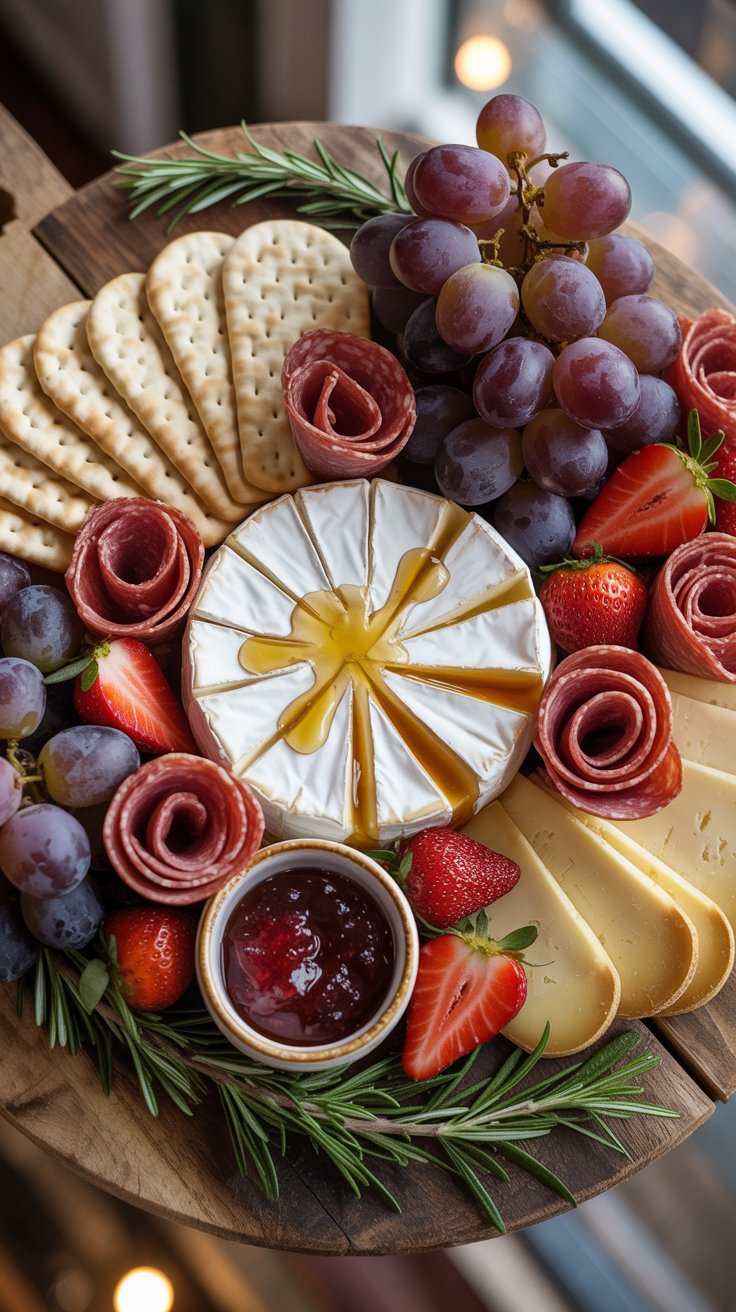 Start with your wheel of brie in the center that’s your anchor. Layer crackers around it like flower petals, then tuck strawberries and grape clusters on opposite corners. Slice cheddar into thin rectangles (they stack beautifully), then roll salami into tiny roses for a romantic touch. Add rosemary sprigs for a pop of evergreen color and finish with a swirl of honey over the brie. Guests will physically sigh when they see it.
