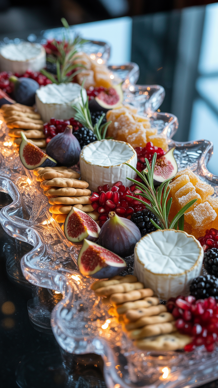 Place cheeses first, then surround them with fruit in rich jewel tones. Add pomegranate seeds, crackers, and nuts to fill space. Dip rosemary sprigs in sugar water and coat in sugar , they look frozen and magical.