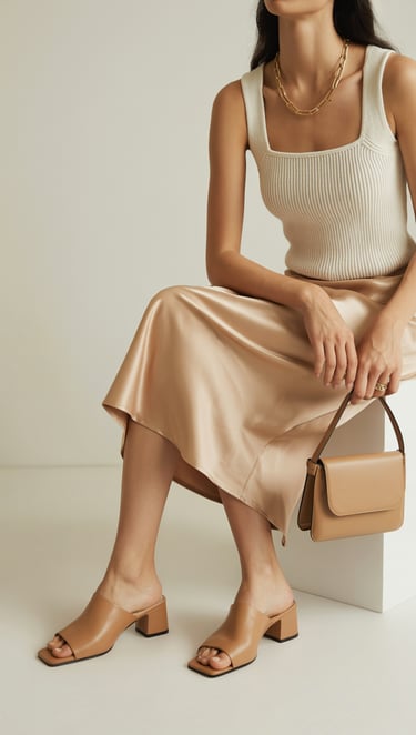 The backless nature of mules creates a clean, uninterrupted line from heel to hem. The contrast between slippery skirt fabric and snuggly knit tank adds textural interest without disrupting the minimalist aesthetic. Every element earns its place.