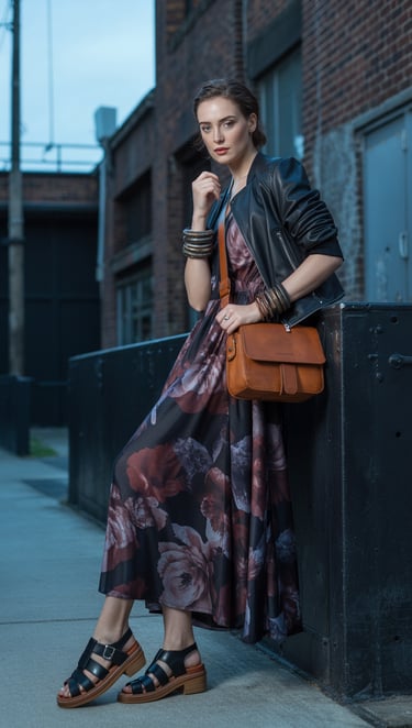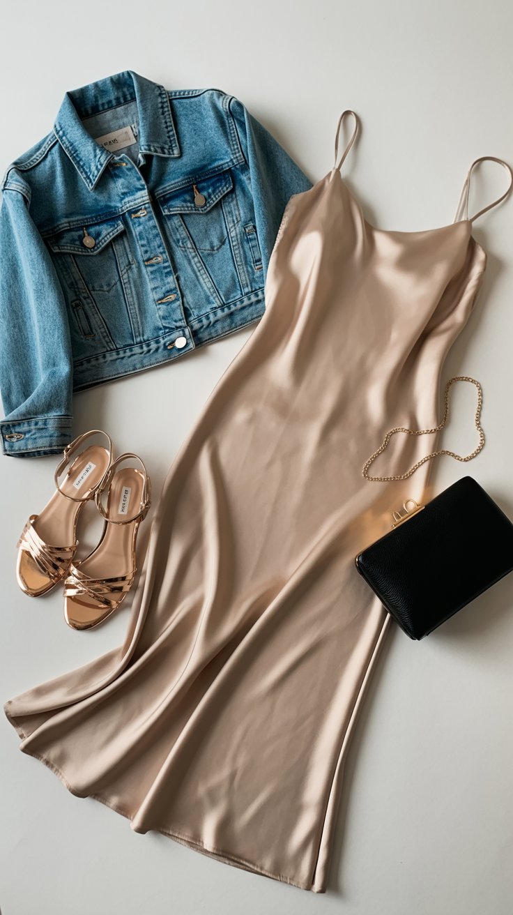 The metallic sheen of the sandals catches light and draws attention to your feet, while the denim jacket grounds what could otherwise feel too dressy. The slip dress provides a sleek canvas that lets both the shoes and jacket shine.