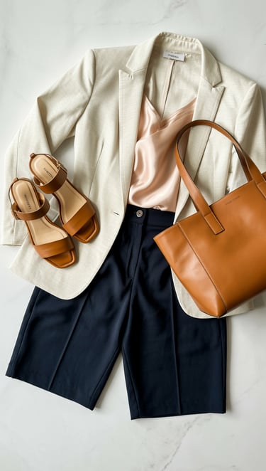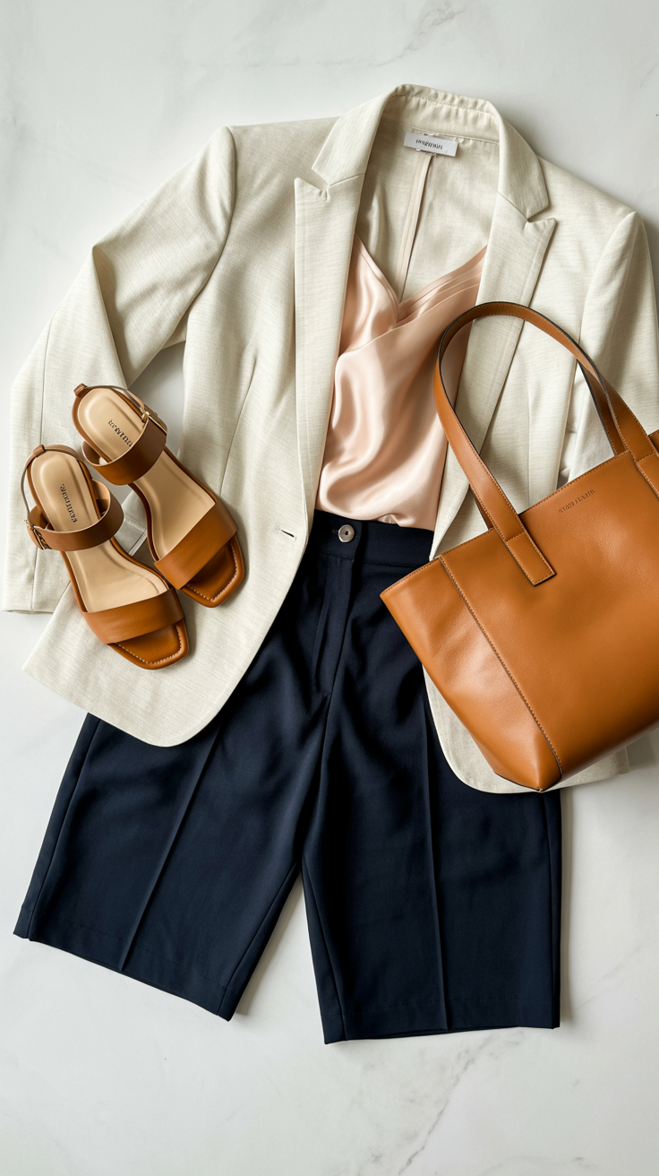 Clean, minimal two strap sandals read as polished without being fussy, perfect for professional settings. The tailored shorts provide the structure of trousers with the comfort of warm weather dressing, while the blazer pulls everything into sharp focus.
