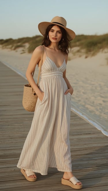 Platform sandals provide essential visual weight that balances the volume of a maxi dress. Without that chunkiness, the dress can overwhelm your frame. The horizontal stripes create width that's perfectly counteracted by the vertical height of the platform. It's proportion play at its finest.