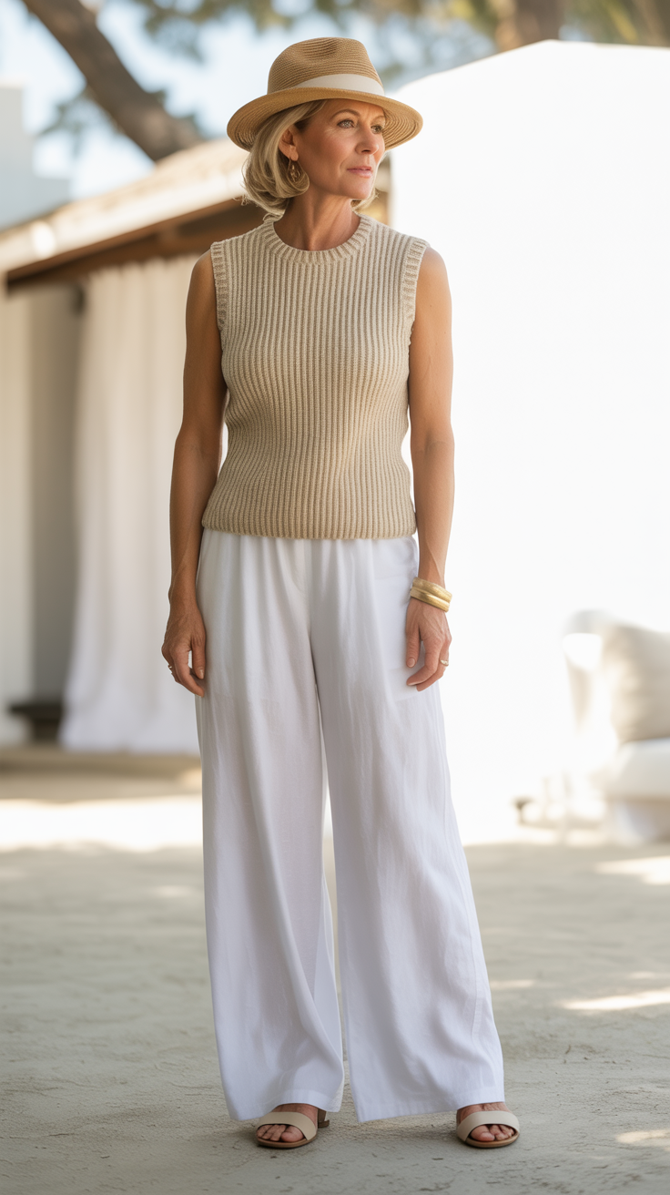 The monochromatic neutral palette creates an unbroken vertical line that's inherently elongating and elegant. Different textures like smooth sandals, nubby linen, and ribbed knit add visual interest without disrupting the clean color story.