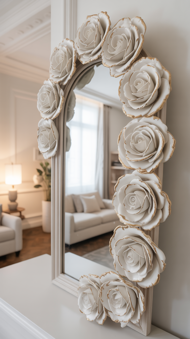 🤍 3. Pearly White Floral Mirror (Romantic & Minimal)