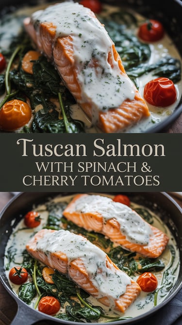 A creamy Tuscan sauce bubbling around salmon fillets, wilted spinach, and sweet cherry tomatoes — like a mini vacation to Italy.