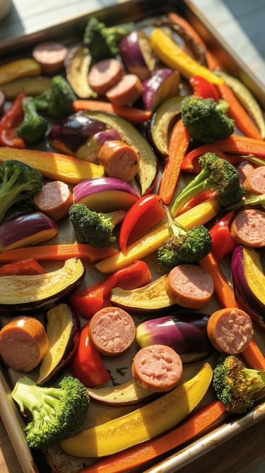 Roasted veggies glistening beside golden turkey sausage slices, a rainbow of flavor on one sheet pan.