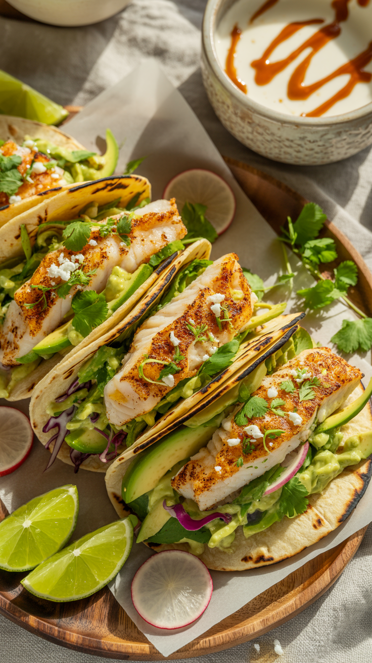 Warm tortillas filled with crispy fish, creamy avocado slaw, and a squeeze of lime. Light, coastal, and full of life. 🌮🌊