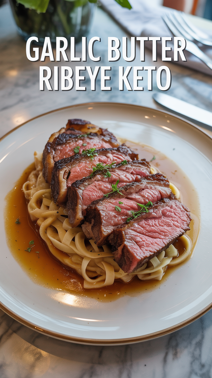 Slice the ribeye against the grain and serve it over the garlic butter noodles. Spoon extra pan sauce over the top — that sauce is gold!